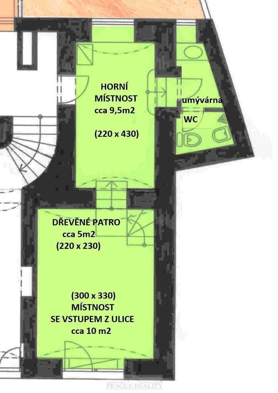 Prostor je velmi atypický, víceúrovňový a členitý. Při vstupu z ulice se nachází menší kancelář s výlohou (300x330cm), ze které vedou schody na dřevěnou galerii (230x220cm - výška stropu na galerii cca. 2m), a z galerie je dále vstup do další horní kanceláře (220x430cm) a do umývárny s WC. Horní kancelář má i soukromé vchodové dveře z chodby domu.
