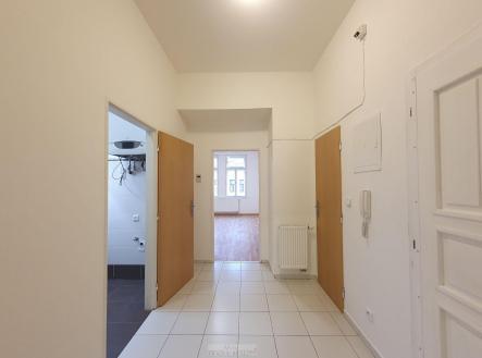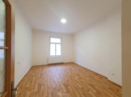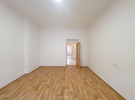 Byt je ve velmi dobrém, udržovaném stavu, nyní kompletně nově vymalován. Je pronajímán nezařízený (je zde pouze kuchyňská linka a sporák). Na topení a ohřev vody vlastní plynový kotel. Má vstupní předsíň, směrem do ulice obývací pokoj s kuchyňským koutem, směrem do klidného dvora velkou ložnici a uprostřed koupelnu s vanou a oddělené WC.