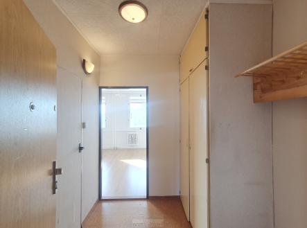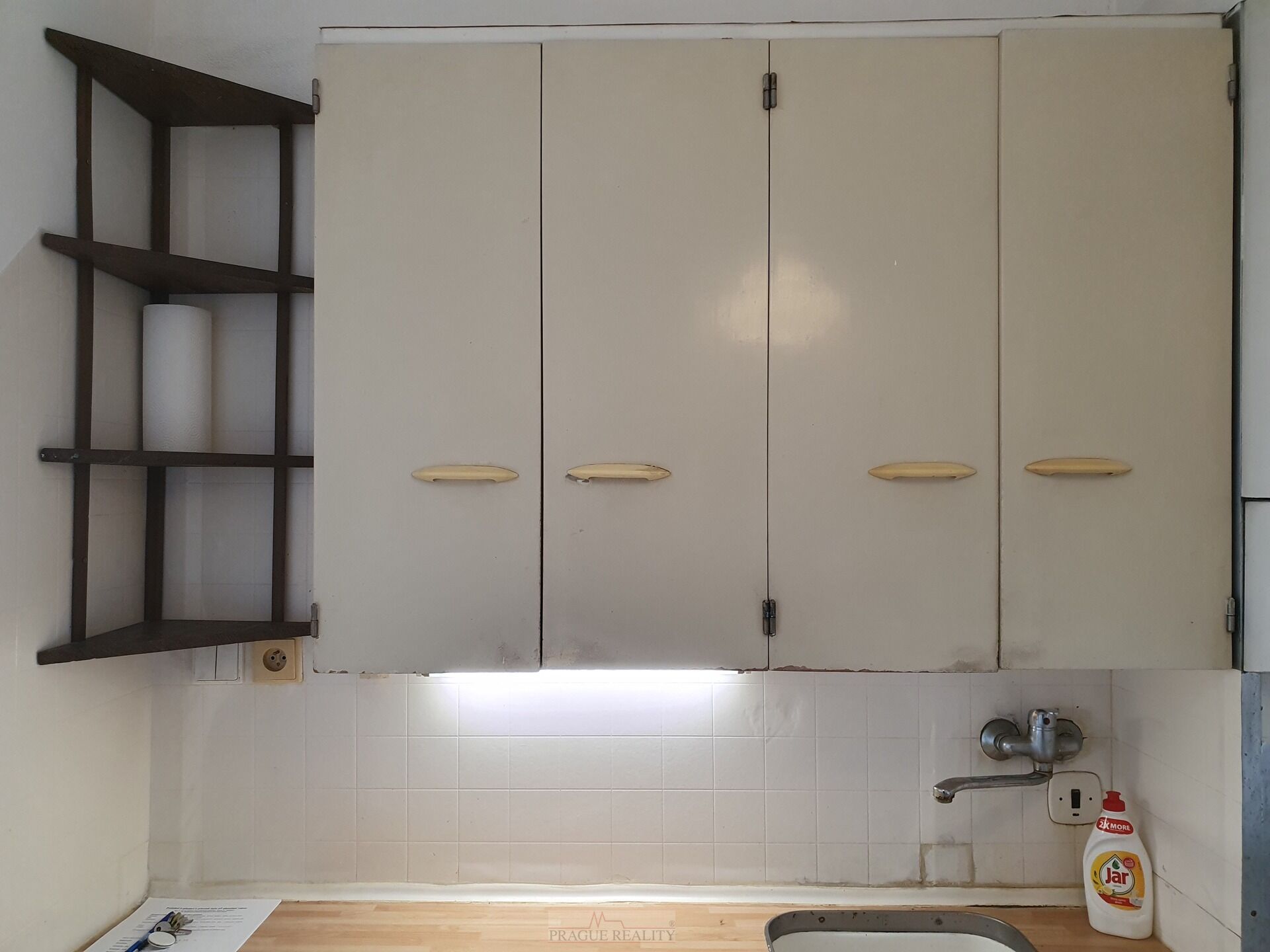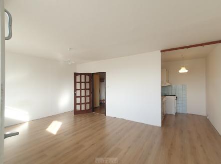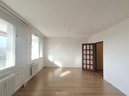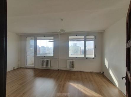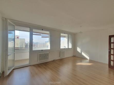 Byt je krásně slunný, má opravdu velký pokoj s částečně odděleným kuchyňským koutem a velikou zasklenou lodžii, orientovanou do naprostého klidu a zeleně na západ.